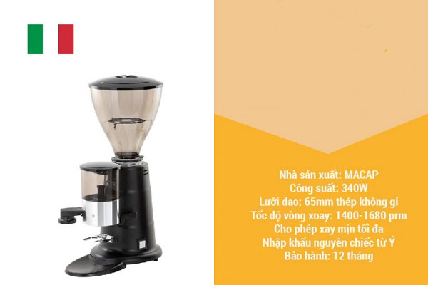 Macap là thương hiệu nổi tiếng của Ý hoạt động ở trên 70 quốc gia. Các sản phẩm của thương hiệu này đa dạng từ máy xay truyền thống đến máy xay cà phê hòa tan. Đây là thương hiệu được sự tin dùng của nhiều hãng cà phê nổi tiếng trên thế giới.