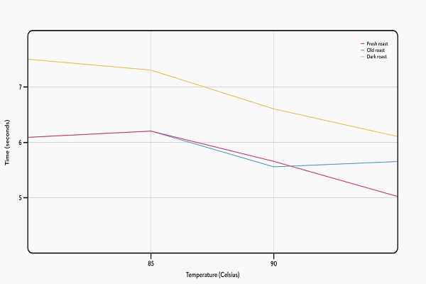 Chúng tôi đã thực hiện các bức ảnh từ ba loại cà phê – rang để ba tháng, rang nhẹ và rang đậm hơn, chú ý kiểm soát các yếu tố như nhiệt độ máy xay (chi tiết thử nghiệm đầy đủ bên dưới). Chúng tôi thấy rằng thời gian chiết xuất không thay đổi tổng thể theo nhiệt độ cho bất kỳ ba loại cà phê nào.