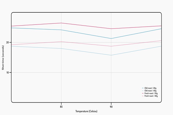 The effect of temperature on the time taken to dispense the last 20 g of each shot. The last part of the shot runs more quickly at higher temperatures. The difference is bigger for the fresher roast, and biggest of all for the dark roast.